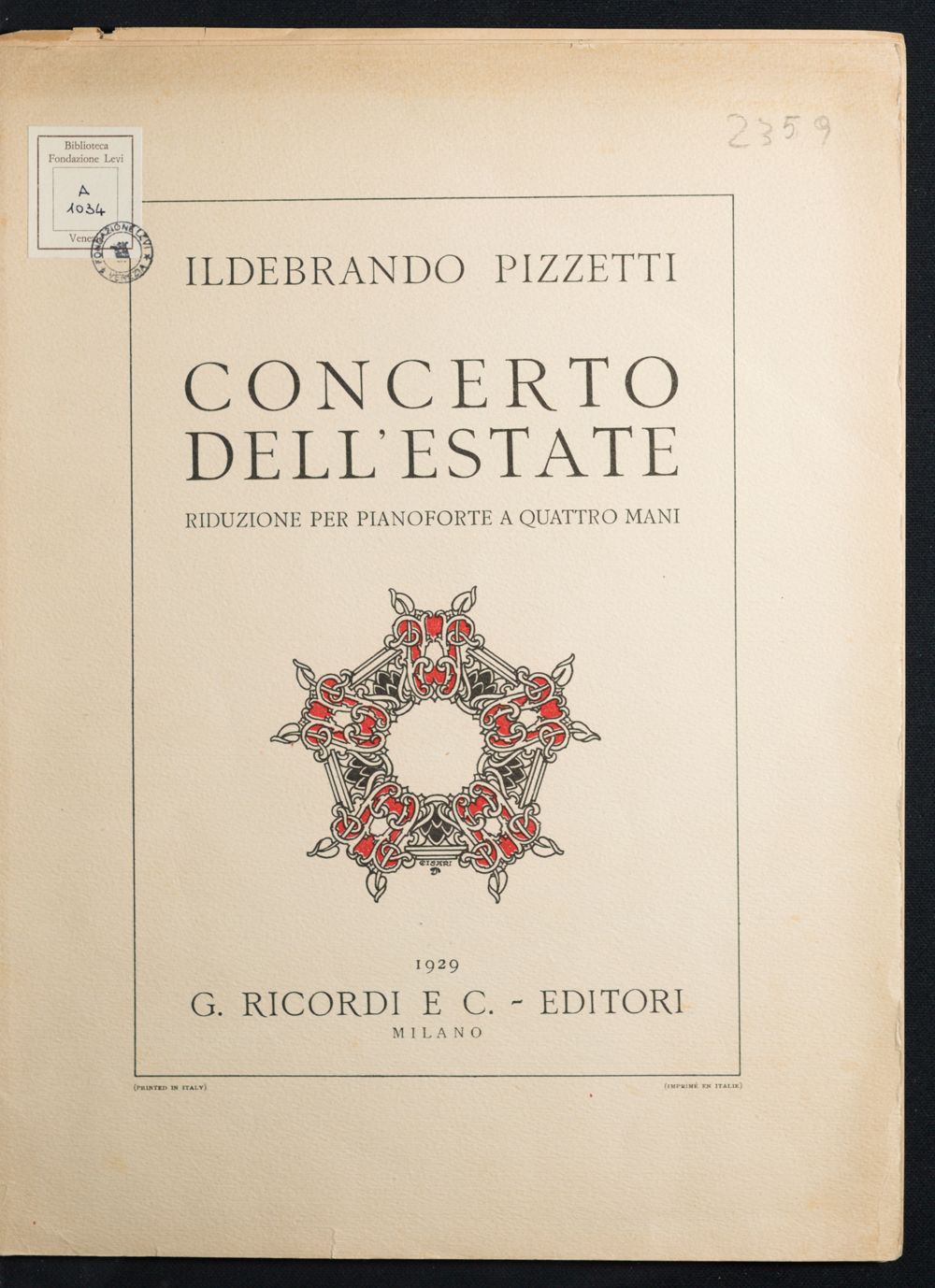 Concerto dell'estate : per orchestra / Ildebrando Pizzetti ; riduzion…